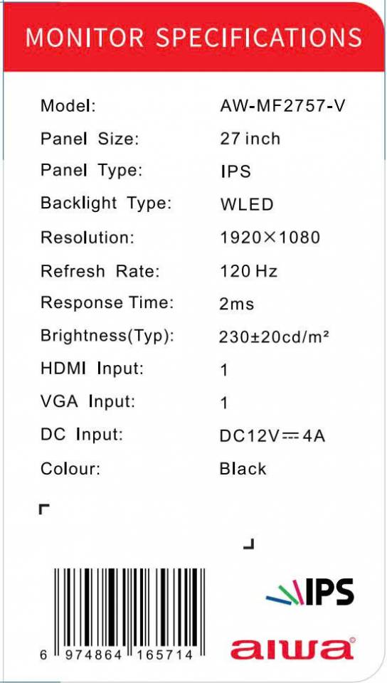 Trong nhu cầu làm việc đa nhiệm và giải trí hiện nay, màn hình 27 inch mang lại không gian hiển thị rộng rãi, thoải mái hơn khi sử dụng lâu dài. AIWA AW-MF2757-V được trang bị tấm nền IPS, tần số quét 120Hz và thời gian phản hồi 2ms, đáp ứng tốt cho văn phòng, học tập, xem phim và gaming phổ thông.